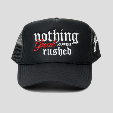 Nothing Great Happens Rushed Trucker Hat (BLACK)